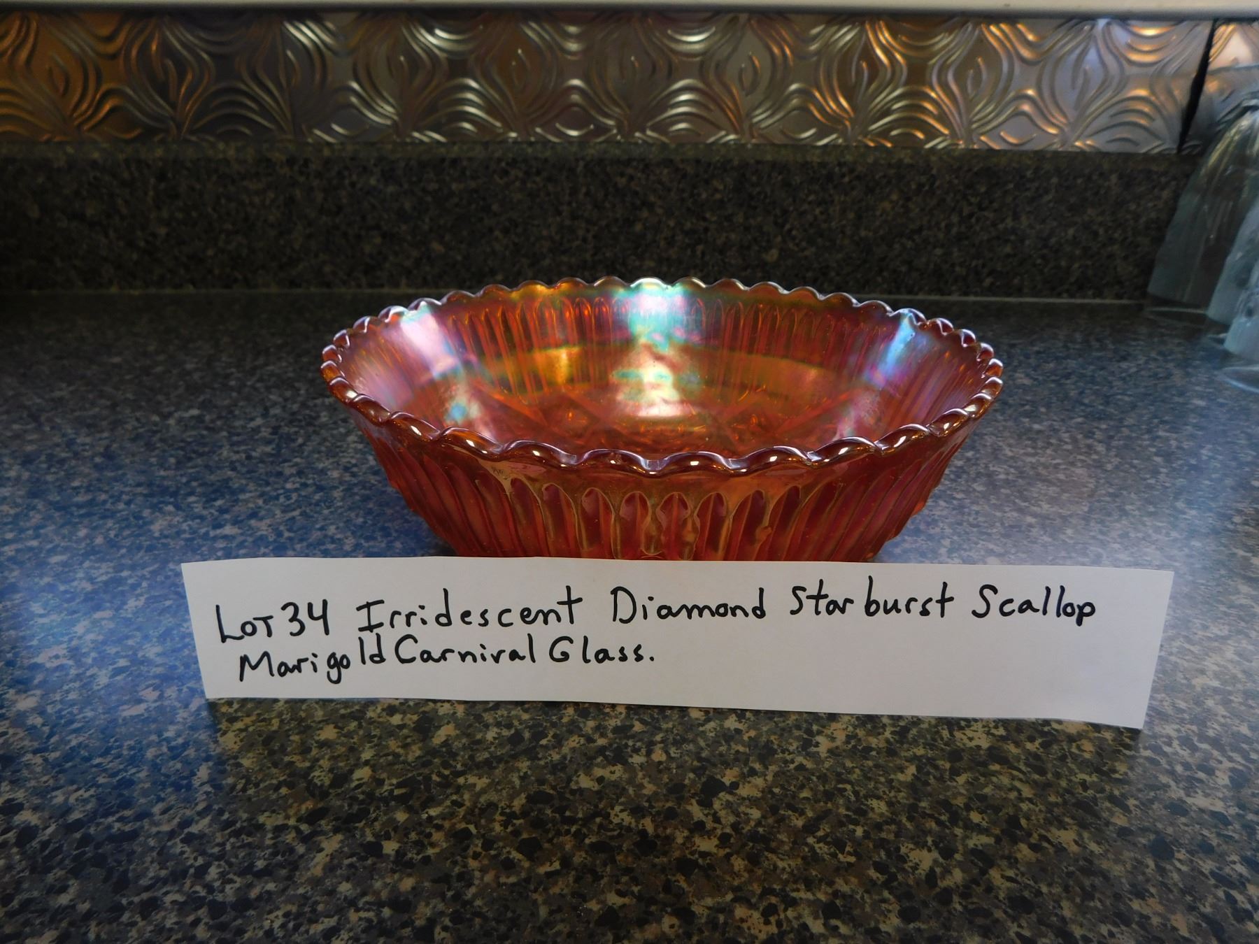 IRRIDESCENT DIAMOND STARBURST SCALLOP MARIGOLD CARNIVAL GLASS