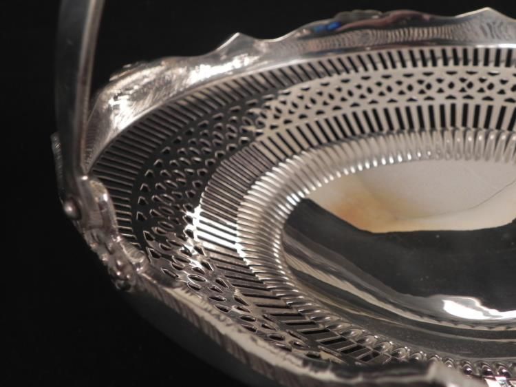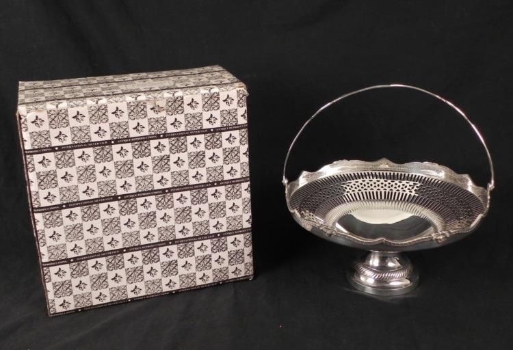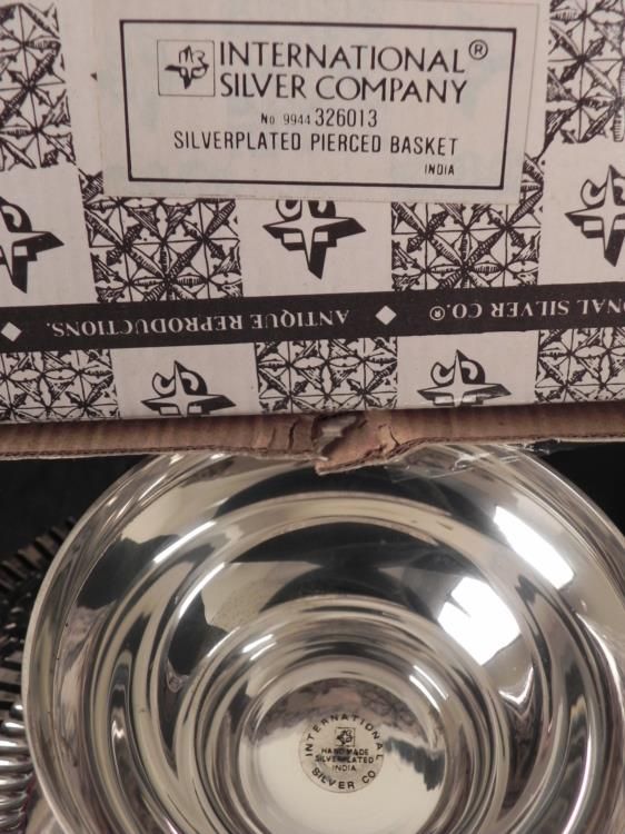 This is a Silver Plated pierced basket from International Silver Company, made in India. It features a lovely pierced design, decorative rim, and elegant handle. The dimensions are 12" in diameter and 5 1/2" tall to the top rim. It is in near mint conditi