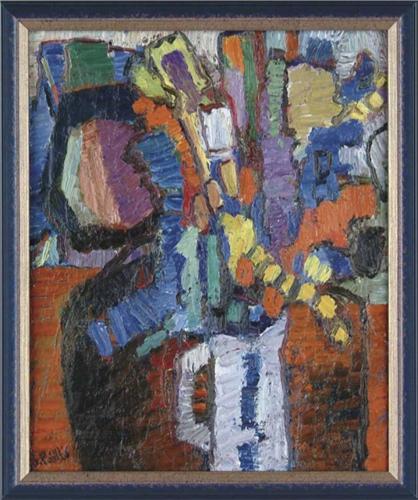 ISAAC PAILES (French, 1895-1978) ABSTRACT PITCHER OF FLOWERS. Colorful oil on canvas scene shows a white and blue pitcher holding a large bouquet of abstract colorful flowers. Painted with a thick pallet. Signed lower left “I Pailes”. Housed in a modern blue painted and gilt molded wood frame. SIZE: 16” x 13”. CONDITION: Very good. 9-27728