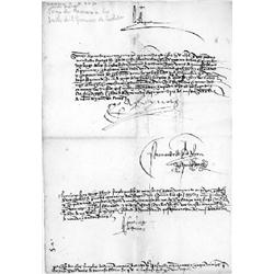 <b>344. ISABELLA I </b>(1451 - 1504)<b> </b>"Isabella the Catholic", Queen of Spain (1474-1504) who approved and financed Columbus' proposal to seek out a new route to Far East. Scarce D.S. "<i>Yo la Regna</i>" 1p. folio, Grenada, Sep. 30, 1499 to her Chamberlain Sancho de Paredes instructing him to give several yards of white damask to the friars of San Jeronimo of Cordoba by way of payment for a casket. Two cut cancels professionally mended on verso, not affecting signature and nearly impossible to detect. Very good to fine.<b>$1,500-2,000</b>
