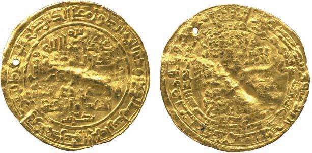 ISLAMIC COINS, Abbasid/Great Seljuq. al-Muktafi/Sanjar and Mas‘ud, Gold Dinar, Takrit 545h, 2.01g. Pierced, about fine and extremely rare.