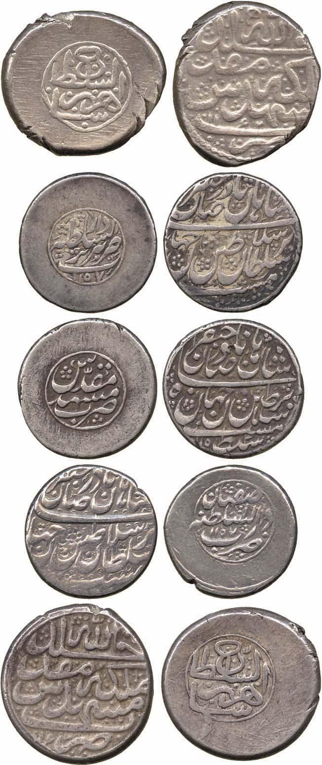 ISLAMIC COINS, Afsharid. Nadir Shah, Rupees (3), Isfahan, 1157, Mashhad 1153, Tabriz 1157; Shah Rukh, Double-Rupees (2), Mashhad, 1162, 1163 (KM 385, 438). Very fine. (5)