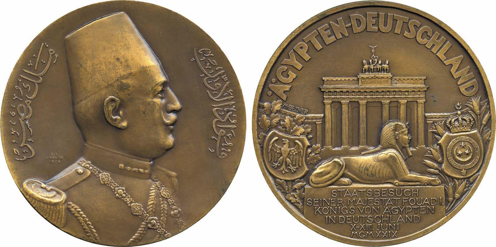 ISLAMIC COINS, Egypt. Bronze Medal, 1929, Visit of Fu’ad I to Germany, by S E Vernier & M Bezner, bust of Fu’ad right, rev Egyptian lion with Brandenburg Gate behind, 72mm (Cairo 6240). About extremely fine.