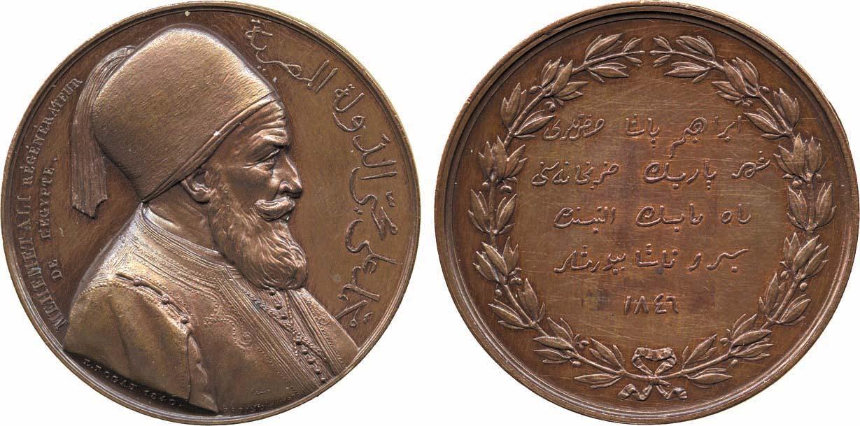 ISLAMIC COINS, Egypt. Bronze Medal, Paris Mint, commemorating the visit of Ibrahim Pasha, the son of Muhammad ‘Ali, to the Paris Mint, 6th May 1846, obv bust of Muhammad ‘Ali to right, MEHEMET ALI RÉGÉNÉRATEUR DE L’ÉGYPTE, to right in Arabic Muhammad ‘Ali muhyi al-dawla al-Misiriya (Muhammad ‘Ali Reviver of the Egyptian State), on the truncation E. ROGAT 1840 and in Arabic the same name with date 1356, rev legend in Turkish, surrounded by wreath of laurel leaves, “His Highness Ibrahim Pasha has honoured the Paris Mint by his visit on the 6th of May 1846”, 50mm, 72.70g. Virtually uncirculated and very rare.