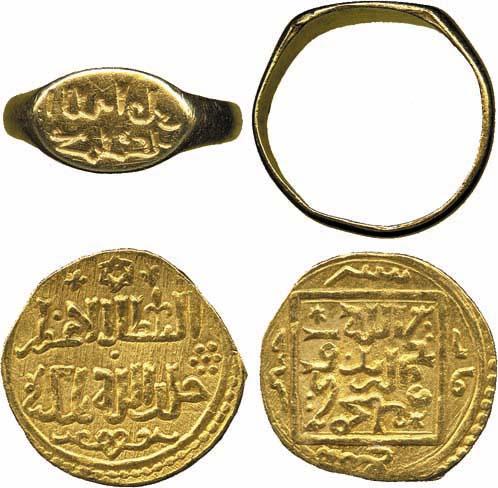 ISLAMIC COINS, Jalayirid. temp. Shaykh Hasan Buzurg (736-757h), Gold Dinar, Irbil 756h, obv “God’s spiritual leaders Muhammad and ‘Ali, Irbil”, 3.75g (unrecorded date for mint), together with a Gold Ring inscribed with similar legend, 3.71g. Both about extremely fine and extremely rare. (2)