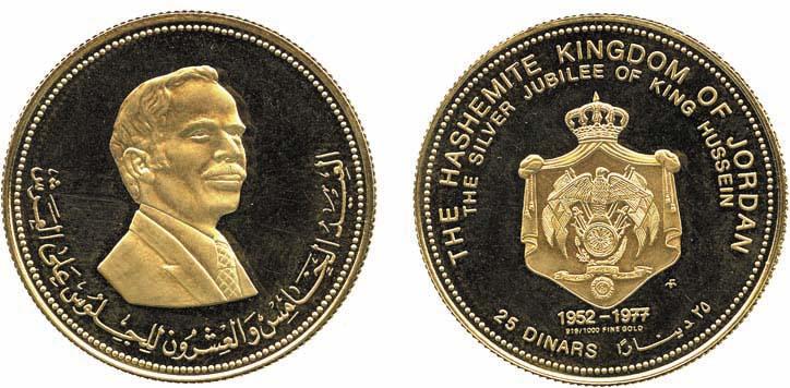 ISLAMIC COINS, Jordan. Gold Proof 25-Dinars, 1977, commemorating the silver jubilee of King Hussein, 15.08g (KM 33). Mint state.