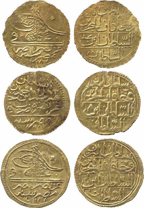ISLAMIC COINS, Ottoman. ‘Abd al-Hamid I (1187-1203h), Gold Zeri Mahbub (3), Misr 1187h, year 1, ‘abd, year 8 (Pere 664, 666; KM 126, 127). Very fine, the second with small edge crack. (3)
