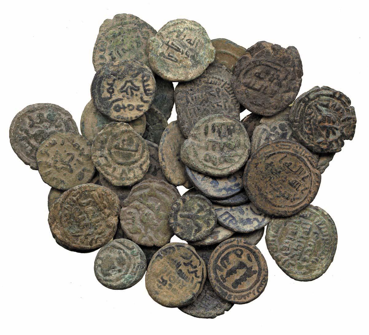 ISLAMIC COINS, Umayyad. Post Reform, Fulus (37), al-Urdunn (W p.228 743 (1)), Baysan (W p.240 Bel.4 (1)), no mint (10), flower bud (W p.203 595 (4)), lion to right (W p.205 603 (2)), plant stalk (W p.206 606 (1)), duck to right (W p.224 730 (2)), duck to left (W p.224 732 (1)), no mint, “common plain” (W p.207 616 (4)), ‘Amman, rev lily (W -; Ilisch Palestina p.42 504-505 (3)), unattributed because of their poor condition (18). Generally fine, some scarce. (37)