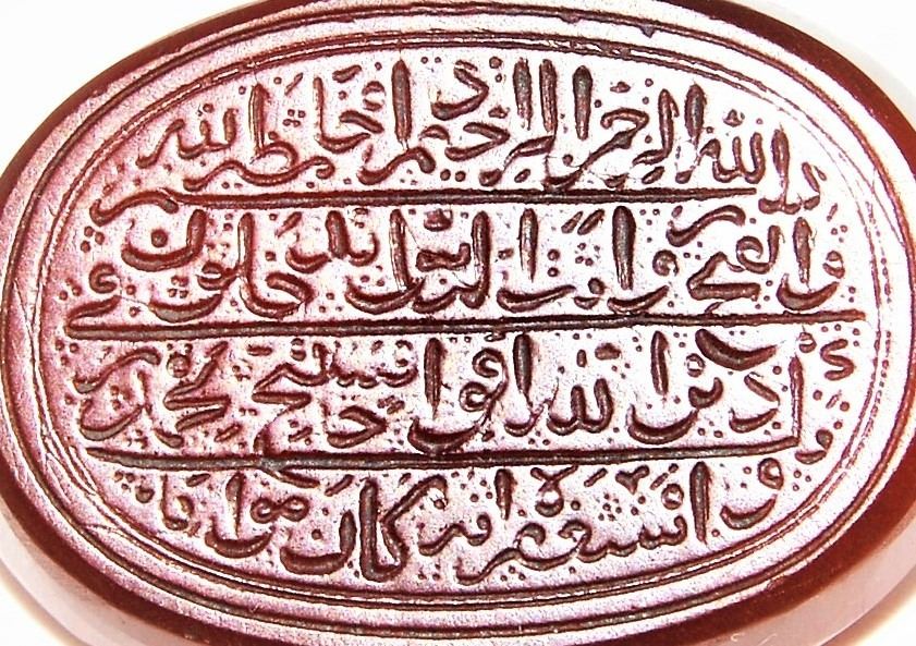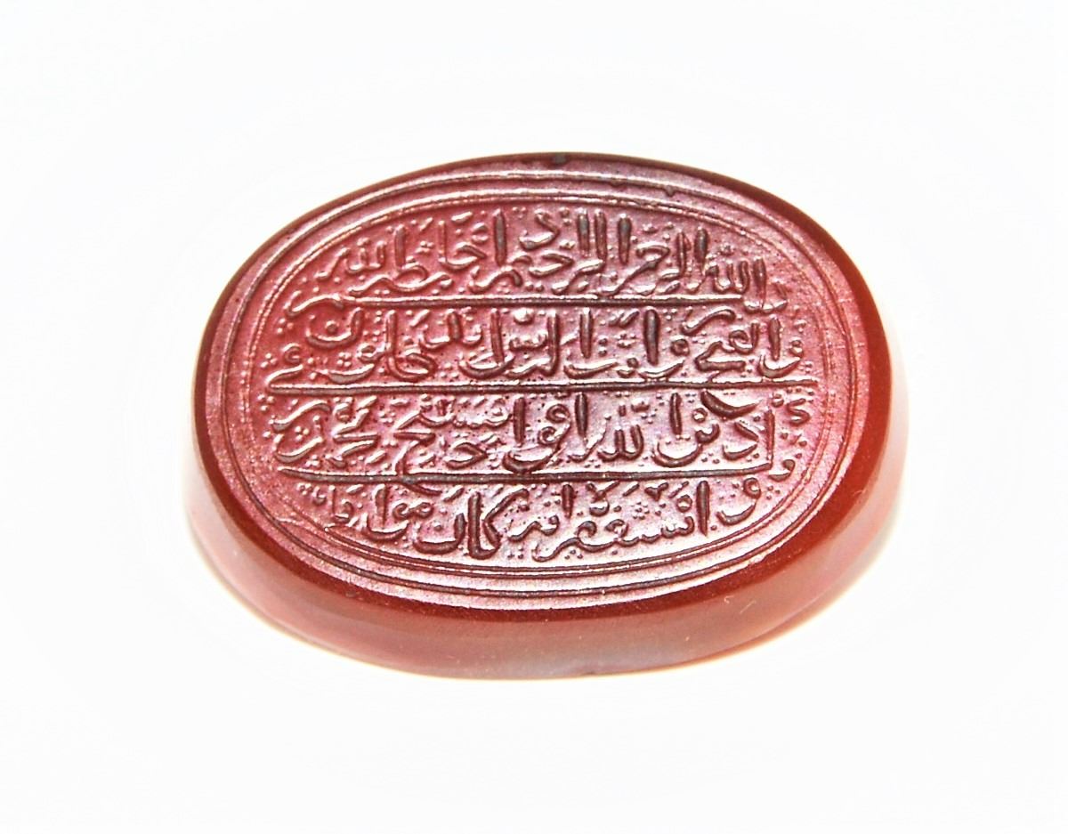 CENTURY, OF SAFAVID & MUGHAL STYLE, carved in reddish agate, of rounded naskh script divided with straight lines, framed by