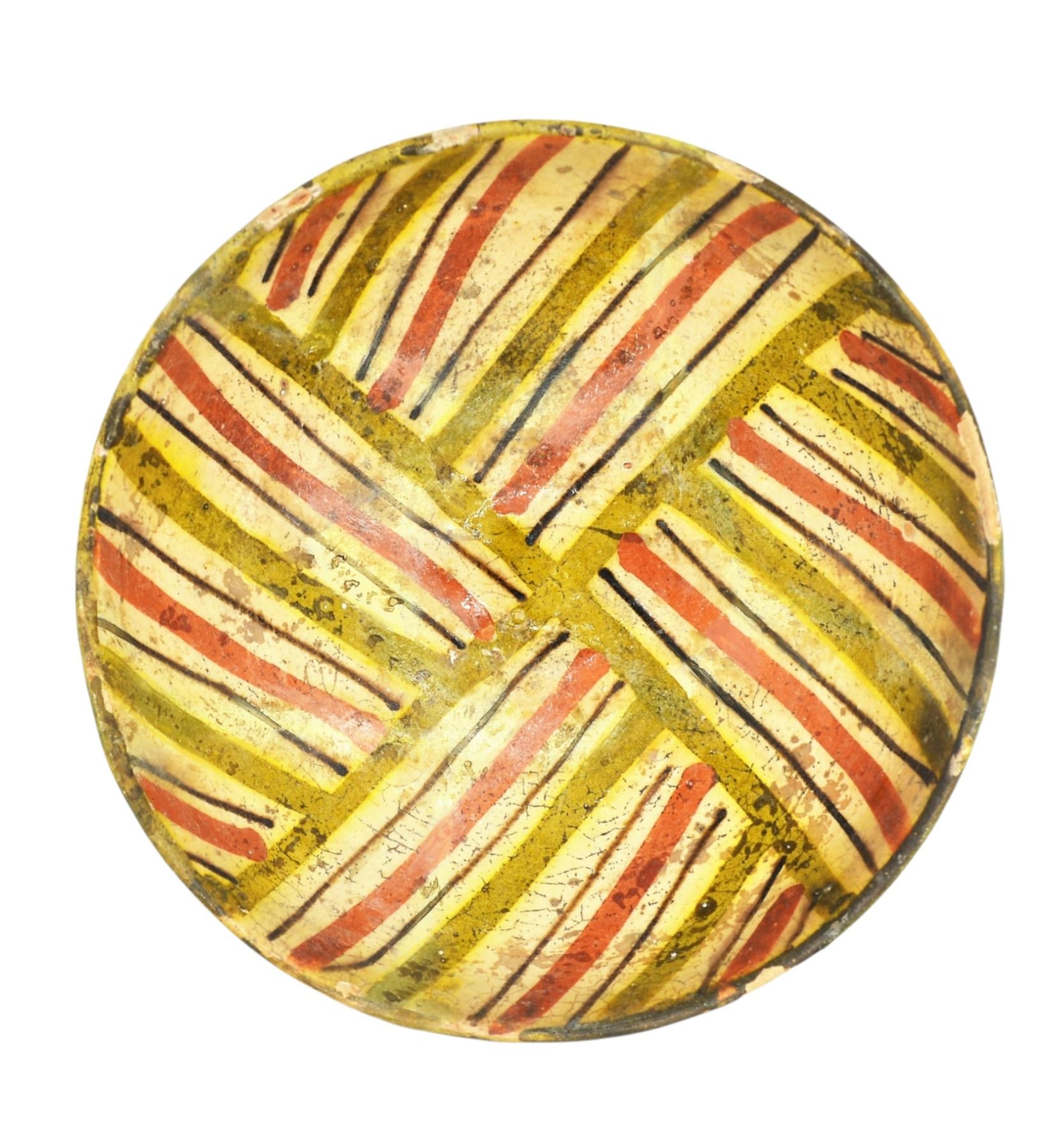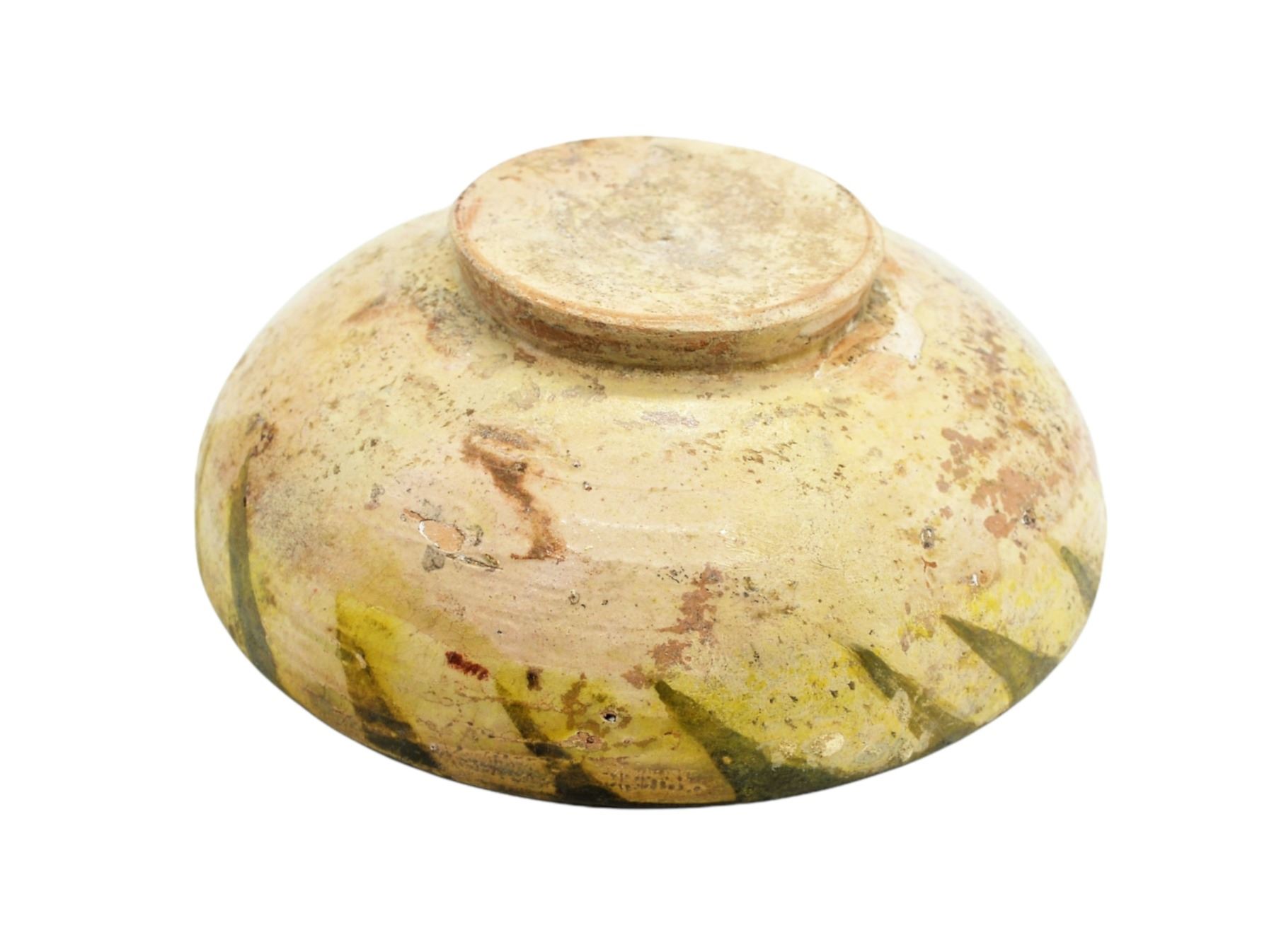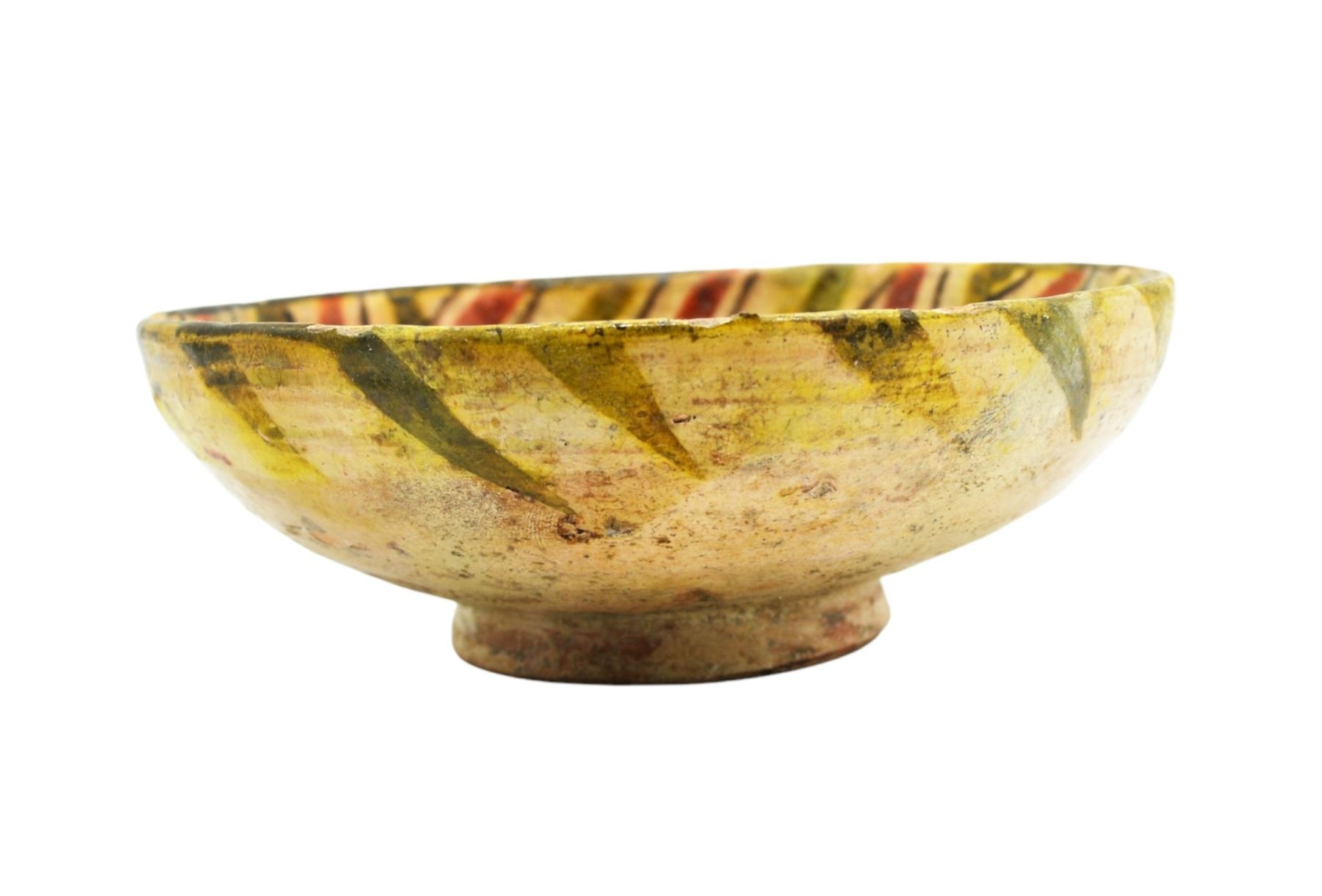 A RARE ANCIENT ISLAMIC NISHAPUR SLIP PAINTED BOWL WITH ABSTRACT DESIGN 10TH CENTURY, CENTRAL ASIA ABBASID & SAMANID PERIOD. Famously Of Nishapuri Style With abstract design. of deep round form with a slightly everted rim, the interior decorated with yellow ochre, red and black slips forming a series of wavy lines springing from a central band with an abstract design. The technique of overglaze lustre firing was a closely-guarded secret in the 10th century and the potters of Nishapur had to be content with replicating the effect of true lustre using underglaze earthy pigments. As with the majority of Nishapur figural designs, the identity of the subject matter remains elusive. A related dish is in the Khalili Collection (Grube 1994, no.36, pp.46-8, London 2004, no.19, pp.68-9)