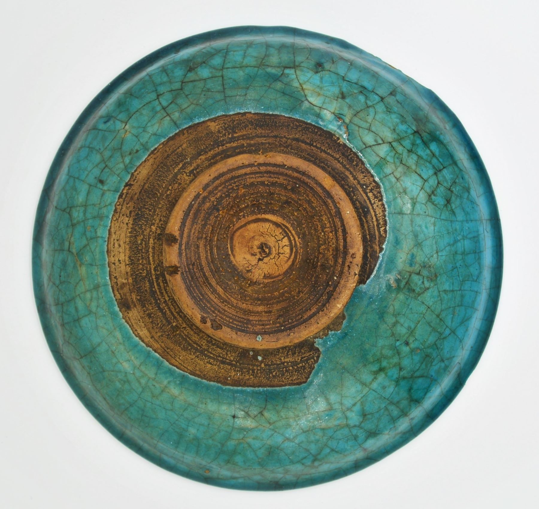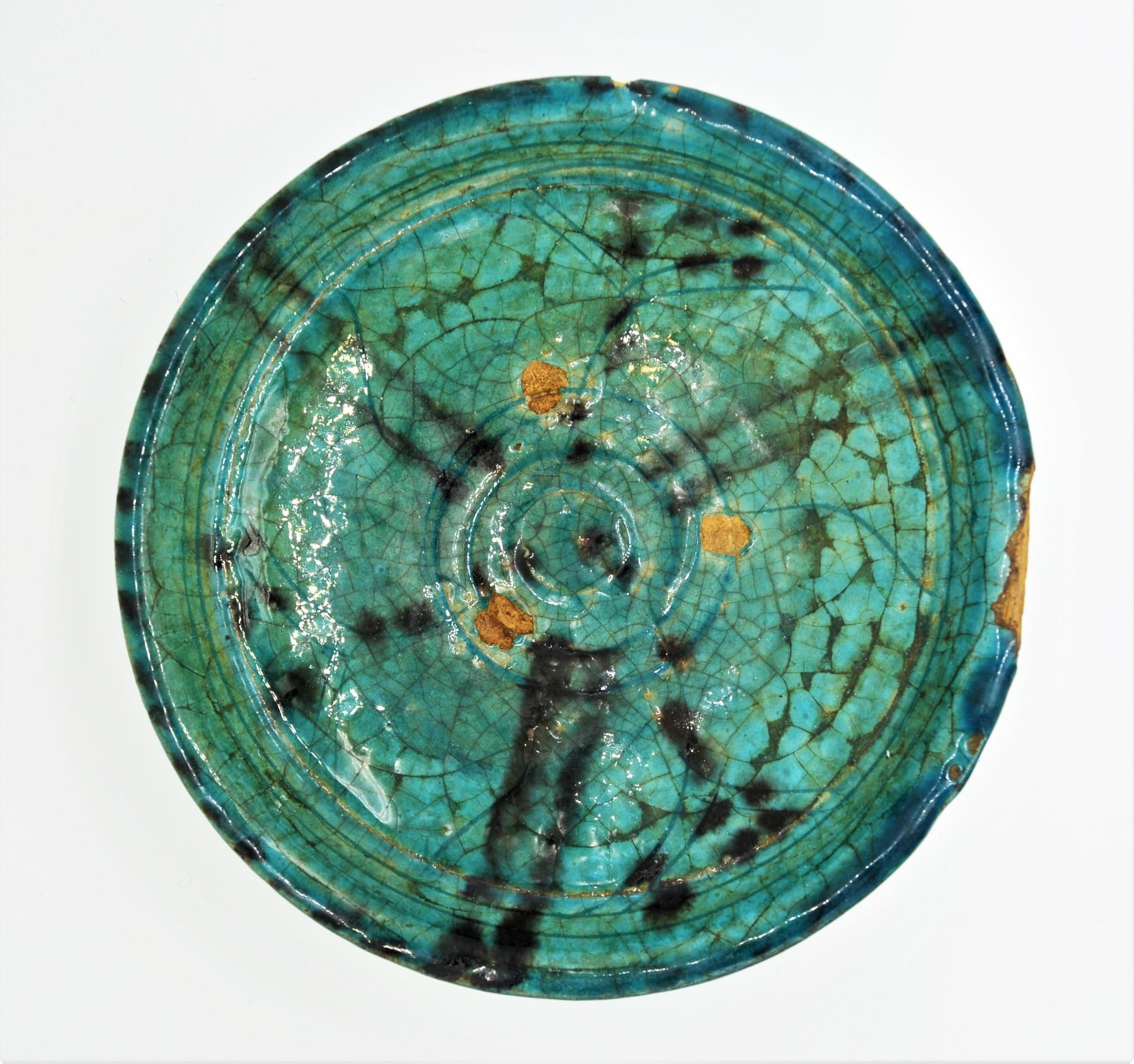 ISLAMIC TIMURID TURQUOISE BLUE AND BLACK GLAZED KUBACHI PLATE 15TH-17TH CENTURY. possibly Timurid or safavid. On short foot & wide slightly flaring rim, painted in turquoise and black glaze, the centre with swirling sun-motif with rays extending to rim, the rim with Different Colors of blue, by horizontal thin black lines.