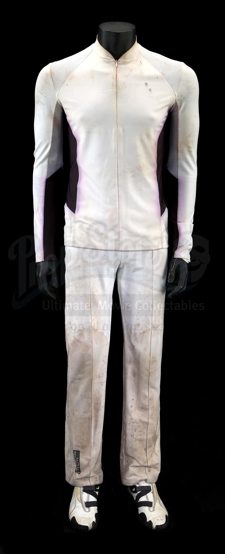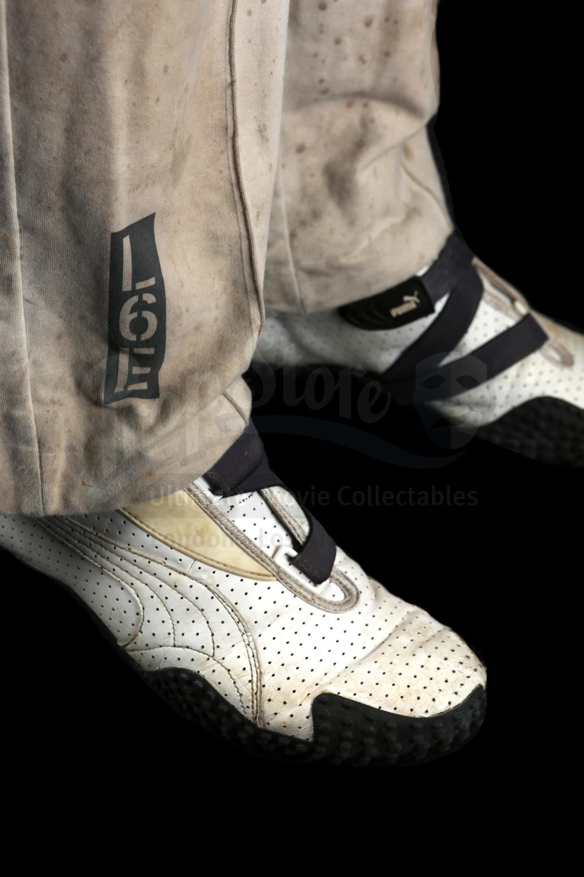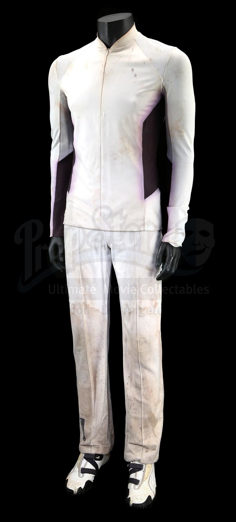This costume consists of a cream-and-grey Spandex-and-mesh zip-up shirt with "L6E" emblazoned on the right sleeve and the barcode "CY28870 6109529" on the back; a pair of matching cream pants with a grey stripe; a pair of black-and-white leather Puma sneakers (size 9) marked "L6E" on the tongue; and a wardrobe tag which reads "Lincoln Chg. 4 dirty". The costume is intentionally distressed and stained with faux dirt and grime throughout.