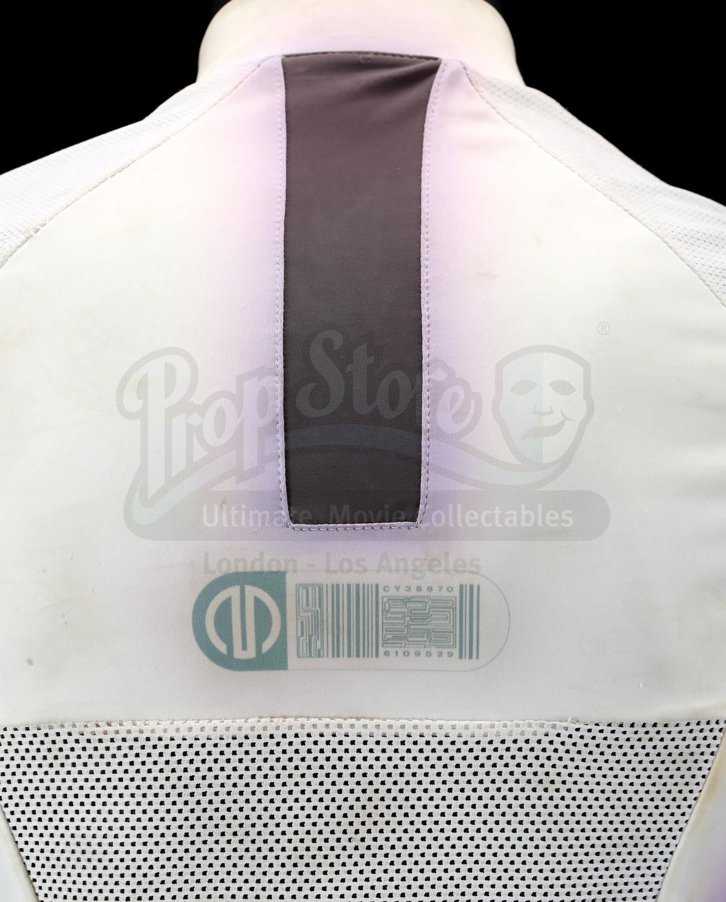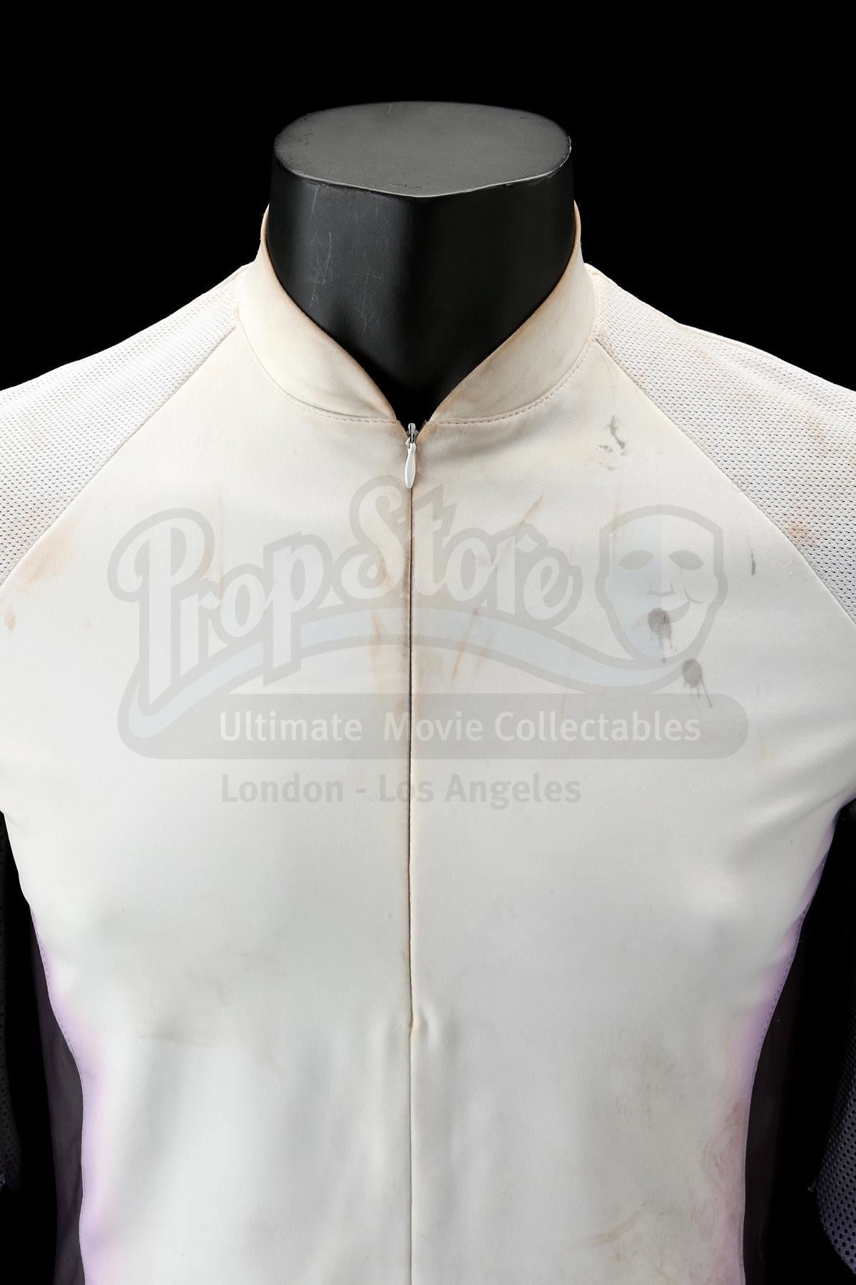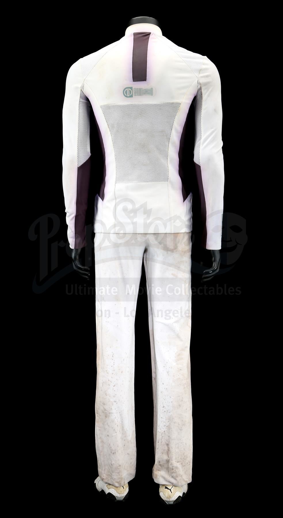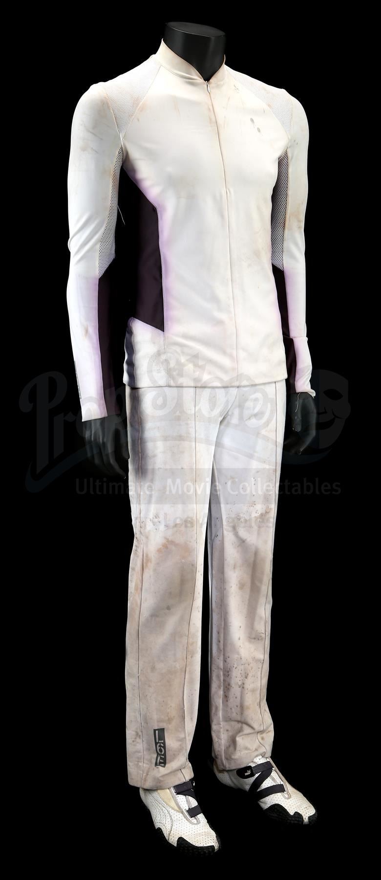 This costume consists of a cream-and-grey Spandex-and-mesh zip-up shirt with "L6E" emblazoned on the right sleeve and the barcode "CY28870 6109529" on the back; a pair of matching cream pants with a grey stripe; a pair of black-and-white leather Puma sneakers (size 9) marked "L6E" on the tongue; and a wardrobe tag which reads "Lincoln Chg. 4 dirty". The costume is intentionally distressed and stained with faux dirt and grime throughout.