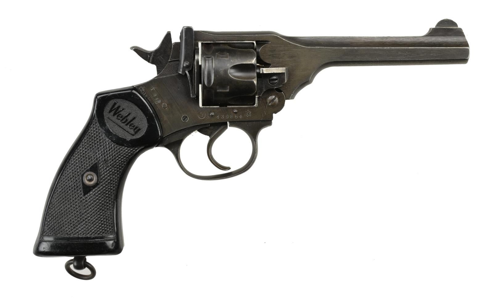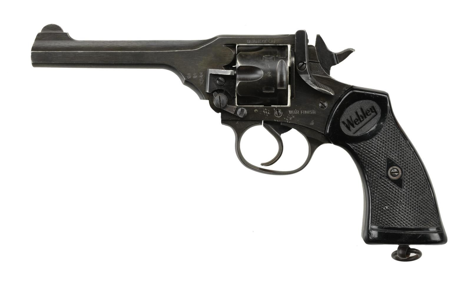 Cal. 38/200. S #139854. Bbl. 5". Matching number on Bbl. & mismatched number on cyl. Left side of frame marked "WAR FINISH". Left side of frame is marked "WAR FINISH". Left side of top strap is marked "MARK IV .38". Scattered British proof markings. Israeli Star of David marking ahead of S # on right side. Checkered black plastic grips w/ Webley logo. CONDITION: grips show scattered light chipping & handling wear. Metal is turning gray w/ a few patches of light dings. Very good bore. (22-2418/MJC). CURIO. $200-400.