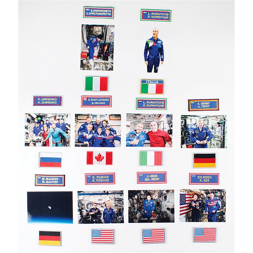 Collection of 20 spare name tags and flag patches designed for nine astronauts and cosmonauts that flew to the International Space Station (ISS) as part of Soyuz and SpaceX missions, including: Klim Shipenko (Soyuz MS-19), Luca Parmitano (2: Soyuz TMA-09M and Soyuz MS-13), Samantha Cristoforetti (Soyuz TMA-15M), David Saint-Jacques (Soyuz MS-11), Christina Koch (Soyuz MS-12), Jessica Meir (Soyuz MS-15), Alexander Gerst (Soyuz MS-09), Matthias Maurer (SpaceX Crew-3), and Kathleen Rubins (Soyuz MS-17). Each embroidered name tag approximately measures 4.5Ë x 1.75Ë and features the cosmonaut and astronaut names in English and Cyrillic in beautiful gold thread, and the flag shoulder patches (Russian, American, Canadian, Italian, and German) each approximately measure 3.5Ë x 2.5Ë_x009d_; the reverse of each name tag and patch features male hoop Velcro. Includes several glossy photos, many of which show the crew members wearing similar name tags and patches during the mission. In overall fine condition.