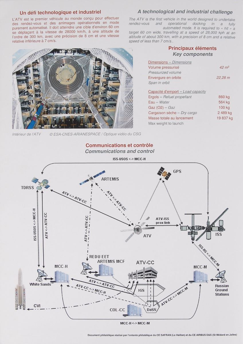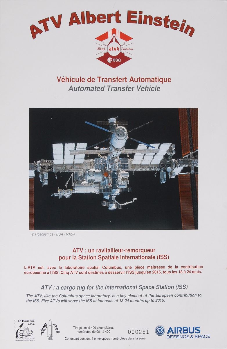 Limited edition presentation of one flown cover and three unflown covers honoring the Albert Einstein ATV [Automated Transfer Vehicle], numbered 261/400, contained within an 8.25 x 11.75 folder. The cover seen in the lower right was flown on the European Space Agency unmanned cargo resupply spacecraft and later cancelled on June 18, 2014, in Houston when the flown covers were recovered. In fine condition. From the collection of aerospace memorabilia specialist Ken Havekotte.