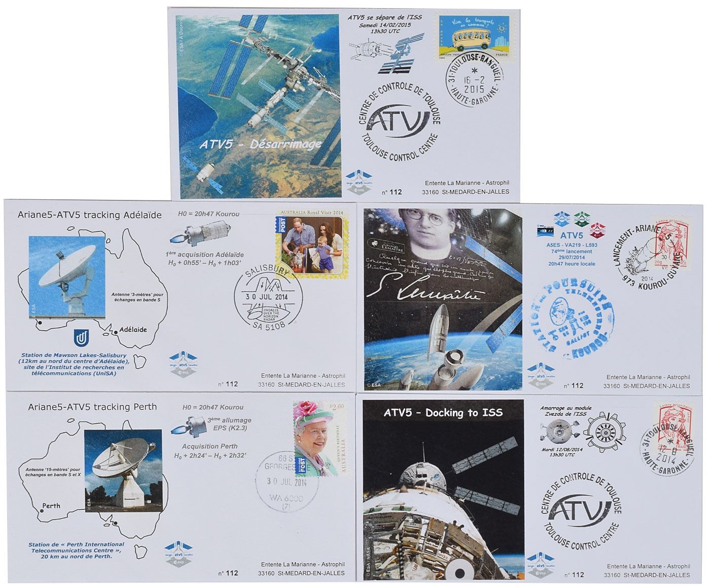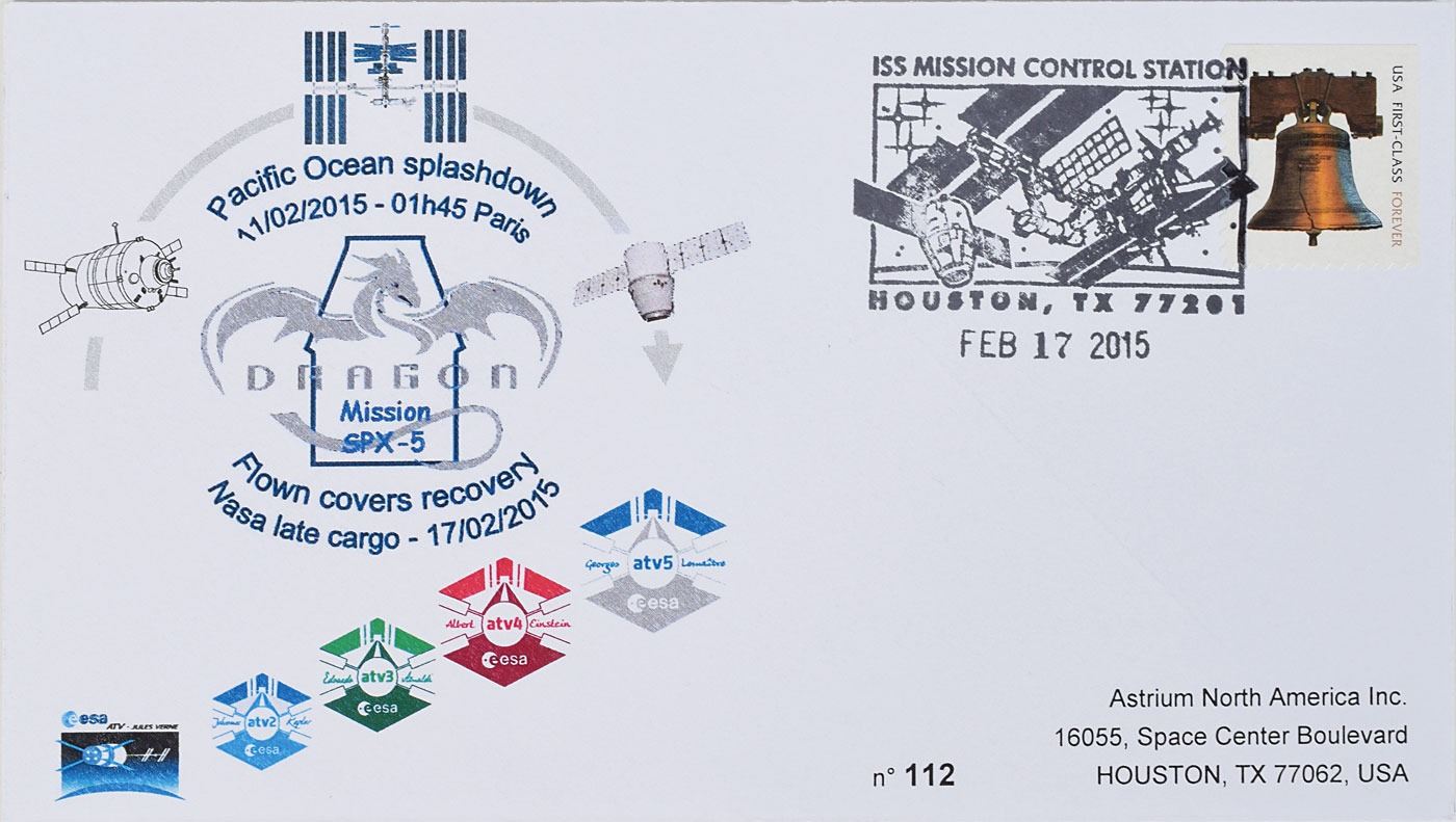 Flown postal cover carried to the International Space Station aboard the Georges Lemaitre ATV cargo resupply spacecraft on July 28, 2014, and returned to Earth aboard the Dragon spacecraft during the SpaceX CRS-5 on February 11, 2015, numbered 112/400, housed in its original Airbus Defence & Space folder. Includes five other unflown covers related to the ATV and SpaceX spacecraft. In fine condition.