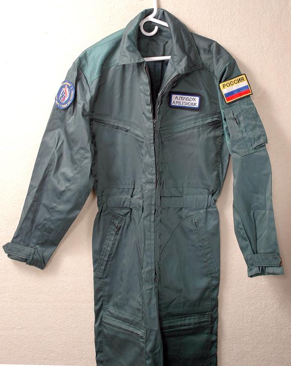 ISS Program, c1994, Training Flight Suit. This dark green, zippered flight suit was worn by cosmnaut Alexander Poleshchuk when he did new program training for Shuttle-MIR and ISS flights. This training was simultaneous with and subsequent to the Soyuz TM-21 training that he had. This suit has a Russian language patch on the right shoulder, a Ruddian Federatin flag on the left shoulder and a bilingual nametag on the chest. The suit appears to be in virtually new condition and is quite striking.