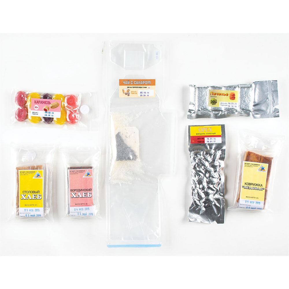Group lot of six cosmonaut space food packages from the International Space Station (ISS), ranging in size from 2.25è x 4.75è to 4.5è x 13.5è, with each bearing labels in Cyrillic dating between 2014 and 2016, with the packages containing the following: honey gingerbread, Borodino bread, dinner bread, salty almonds, caramel candies, and tea with added sugar. In overall fine condition.