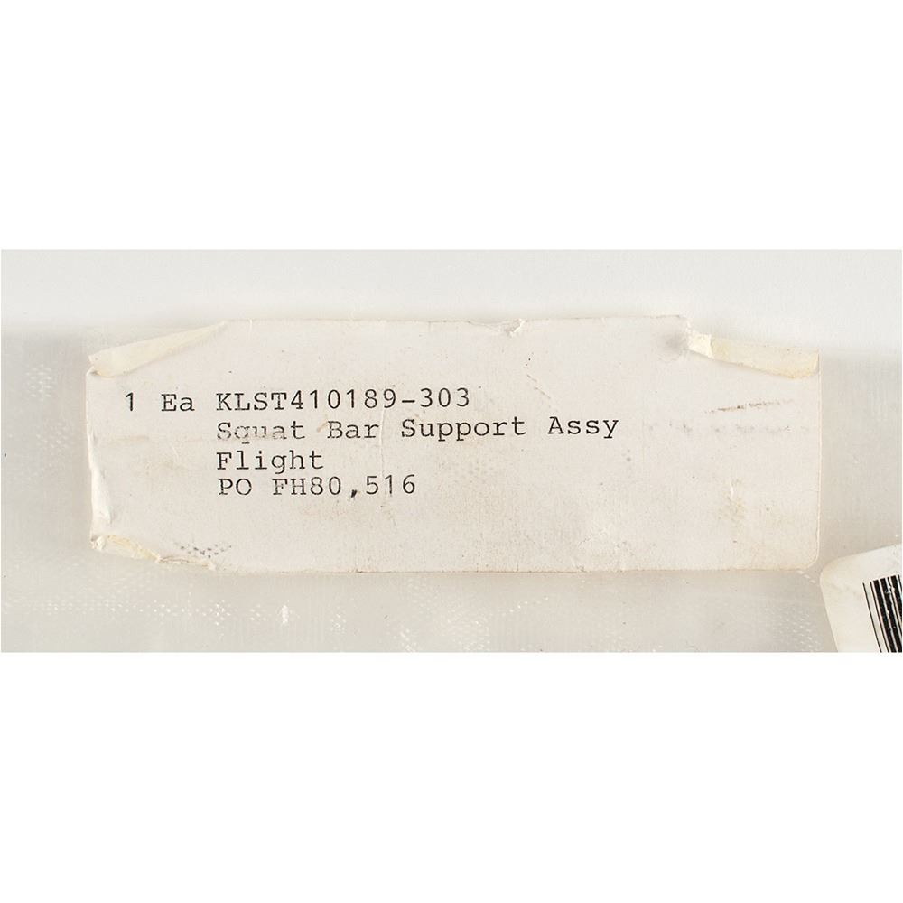 iRED (Interim Resistance Exercise Device) squat support bar attested as flown and used on the International Space Station, measuring 33è in length, and featuring a mountable stopper to the base, and above this a sliding, adjustable squat bar holder with two removable pins, which can be raised and lowered to a preferred height. The upper portion of the bar features an engraved parts section: ‰ÛÏIRED Squat Support, Top, P/N SEG46116034-301.‰Û Includes its original deaccession bag with affixed labels, indicating that this bar is one part of the ‰ÛÏKLST410189-303, Squat Bar Support Assy, Flight, PO FH80, 516.‰Û Also included is a ‰ÛÏJSC Project Parts‰Û tag struck through in red felt tip and marked ‰ÛÏIII,‰Û issued for the ‰ÛÏSquat Bar Support Assy,‰Û listing ‰ÛÏAero-Tech‰Û as the manufacturer, and dated to January 12, 1999. The deaccession bag features a sticker marked ‰ÛÏ2 of 2,‰Û with the first bar also being offered in this space auction. In fine condition.