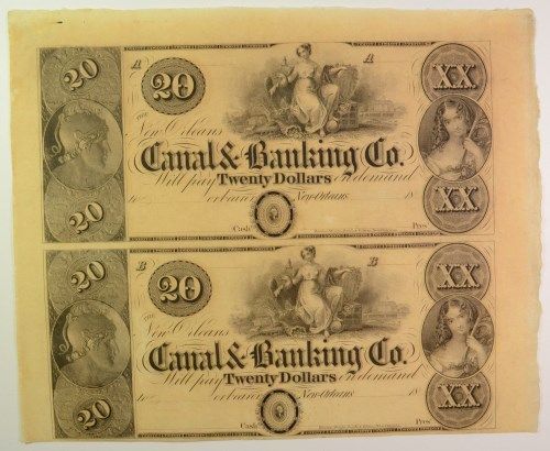 ISSUED 1840-S REMAINDER SHEET 2 $20 CANAL NOTES, NEW ORLEANS, GEM!