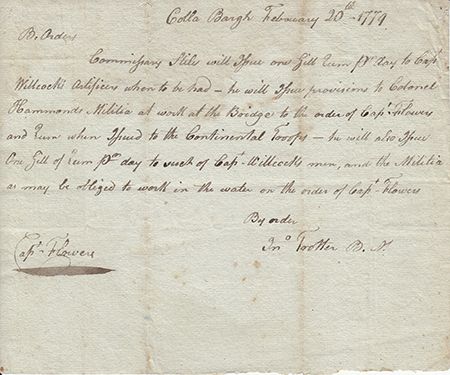 JOHN TROTTER Revolutionary War military officer, an aide-de-camp to Gen. Rufus Putnam. A.D.S., 1p. oblong 9vo., Colla Bargh, Feb. 20, 1779, orders directed to Capt. Flowers. In full: "Commissary Stile will issue one gill rum per day to Capt. Willcocks's Artificers, when to be had. He will issue provisions to Colonel Hammond's Militia at work at the bridge to the order of Capt. Flowers and rum when issued to the Continental Troops. He will also issue one gill of rum per day to such of Capt. Willcock's men and the Militia as may be obliged to work in the water on the order of Capt. Flowers" . Fine.