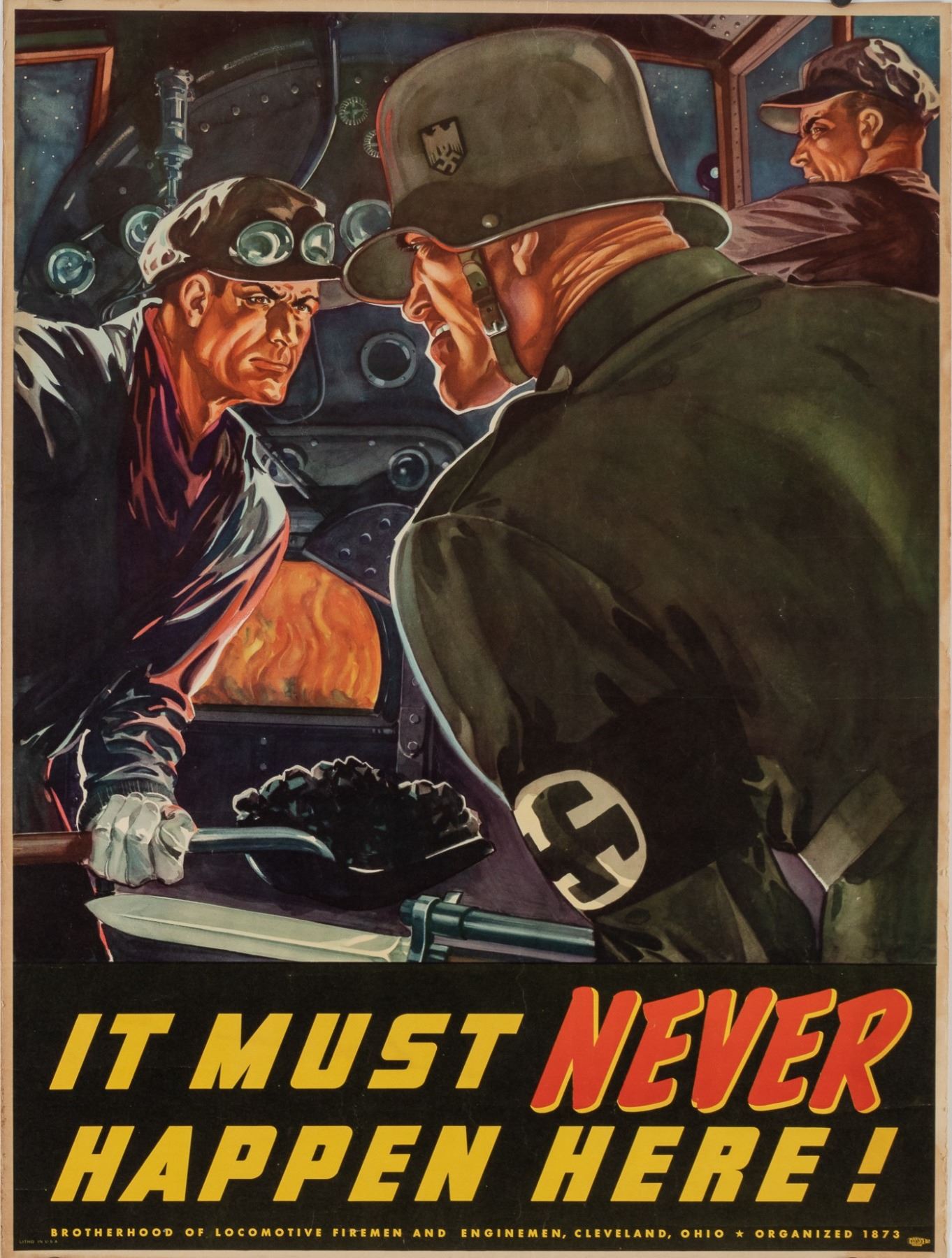 It Must Never Happen Here', Brotherhood of Locomotive Firemen and Enginemen, Cleveland, circa 1943, 27.5 x 20.5 inches. Mailing folds, minor tears. Very good.