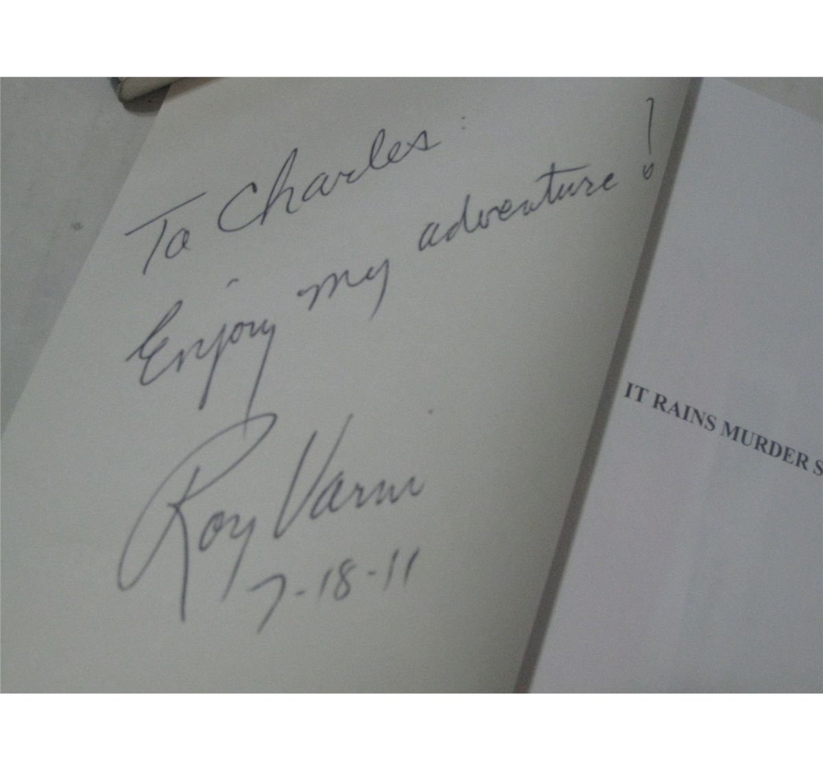 IT RAINS MURDER SOMETIMES IN JUNEAU Softcover Book HAND SIGNED by Roy J. Varni on the inside cover in black ink.