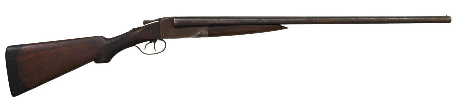 Cal. 20 GA. S# 337286. Bbl 26". SxS shotgun manufactured at the Ithaca Gun Company in Ithaca, NY. Left and right sides of the receiver are lightly engraved with a small scene of a dog above "ITHACA GUN CO. ITHACA N.Y.". Frame exhibits a case color hardened finish, with the barrels being blued. Checkered wood buttstock with screw on checkered wood forend. CONDITION: frame retains traces of its original case color hardened finish, exhibiting wear, discoloration, and areas of oxidation overall. Barrels exhibit wear and scattered oxidation overall. Mirror bores. Wood furniture shows scattered handling marks and wear to the varnish, but otherwise remains sturdy and serviceable. Buttplate shows some losses overall. (23-2393/MLW). CURIO. $200-300.