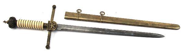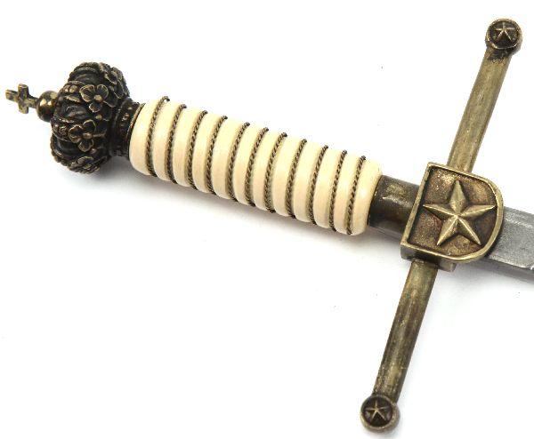 Unmarked 12 inch blade with star emblem cross guard, off-white celluloid grip with wire wrap, and crown shaped pommel with a cross. Overall dagger and brass scabbard in very good condition. Wire wrap slightly loose.