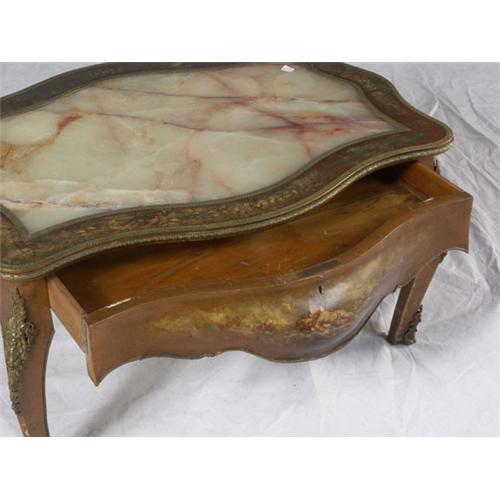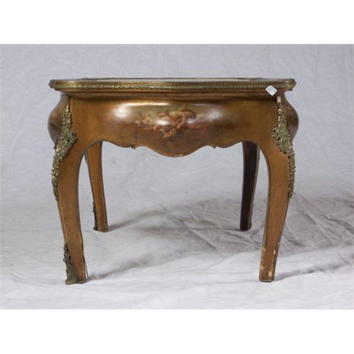 COFFEE TABLE: Italian Baroque style coffee table, serpentine shape top with marble inset, apron painted with putti and flowers, ormolu mounts, cabriole legs. 19''d x 28''h x 36''w