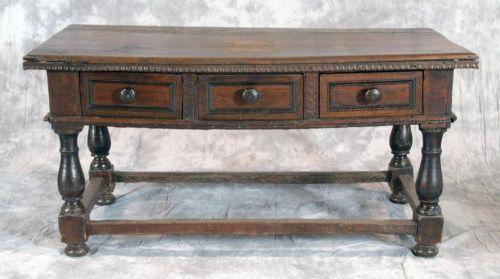 ITALIAN BAROQUE WALNUT LIBRARY TABLE, 64"x31"x31 1/2" high, with 3 drawers, 17th century, restoration to stretchers and legs (2 stretchers replaced), SHIPPING: See recommended third party shippers. This item can't be packed or shipped by seller.