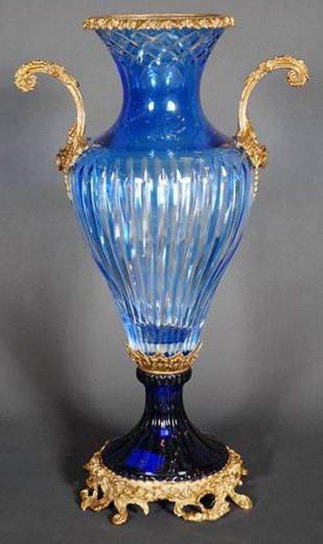FINE ITALIAN BLUE LEAD CRYSTAL VASE - BRASS BASE, HANDLES AND TRIM - HAND CUT CRYSTAL - 9.4L" x 6.2W" x 16.7H"