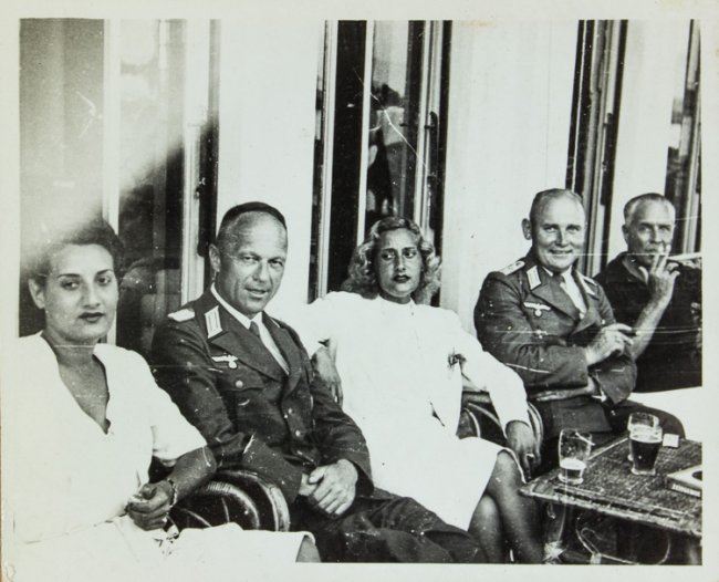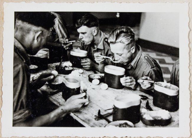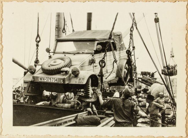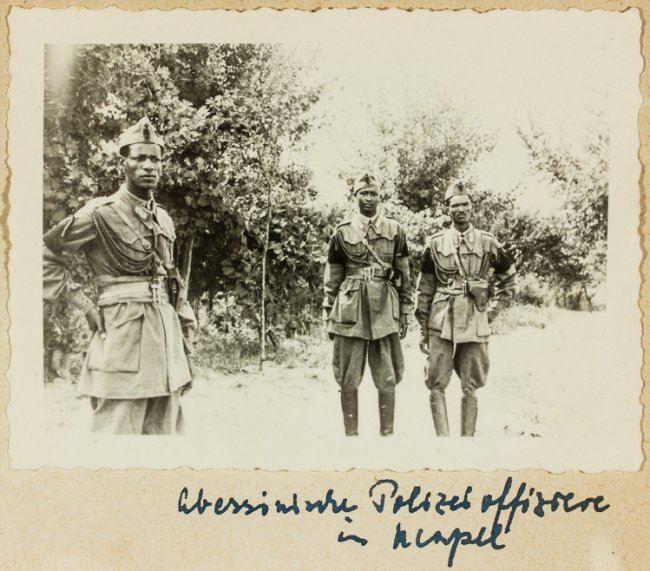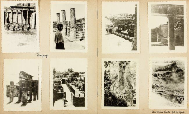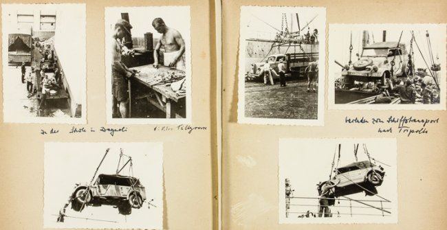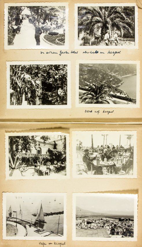 German soldier's photo alum containing about 160 photographs from the Italian campaign, most about 2" x 3". Chronologically, subjects include a tour of Pompeii, "Abyssinian police officers", Rome, Naples, camp in the field, unloading of vehicles from transports, and crowds greeting troops on their return home. Very good.