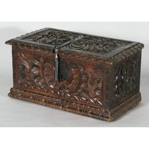 1 ITALIAN CARVED VALUABLES BOX in the Renaissance taste with two secret drawers 17"x 9 1/2"x 8 1/2" late 19th century CONDITION REPORT: feet detached, but present. PACKING AND SHIPPING (excluding insurance) by Fairfield Auction to points within the Continental U.S.A. and Canada (all other international must be handled by 3rd party shipper) $40.
