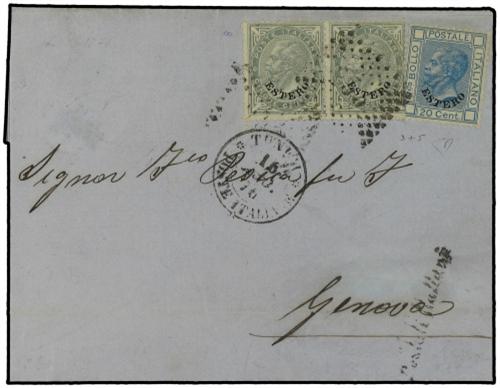 1876 TUNEZ a GENOVA. Franqueada con sellos italianos de 5 cts. verde (2) y 20 cts. azul habilitados ESTERO. Raro franqueo.