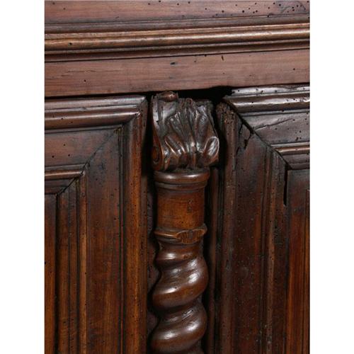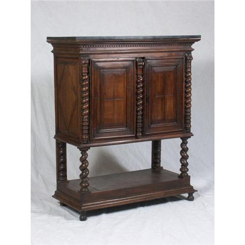 CABINET: Italian country walnut part 18th century cabinet, cabinet with carved barley twist pilasters above barley twist columns on molded plinth with ball feet, black stone top. replacement boards and moldings. 54''h x 21''d 45''w