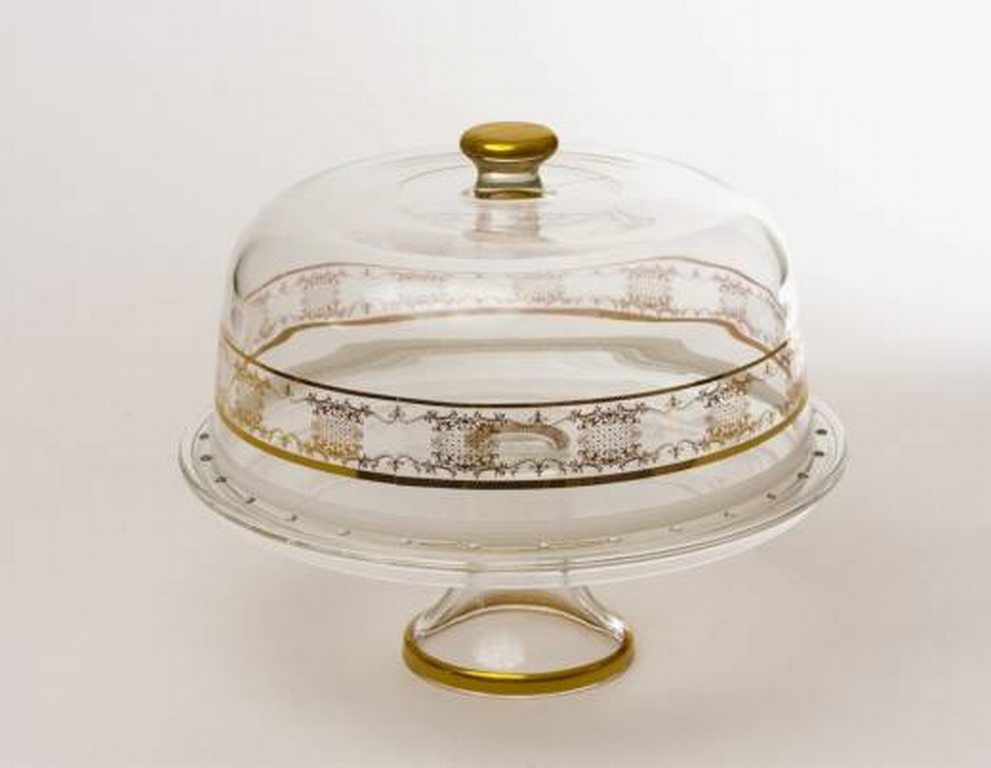 FINE ITALIAN CRYSTAL DOME CAKE PLATE - VENETIAN HAND PAINTED 14 KT GOLD DESIGN - 12"LX12"WX10"H