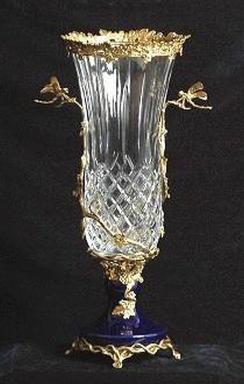 ITALIAN CRYSTAL & PORCELAIN VASE - COBALT PORCELAINBASE - HAND CUT CRYSTAL, BRASS BASE, RIM AND ACCENTS - 18.5L" x 7W" x 9.5H"