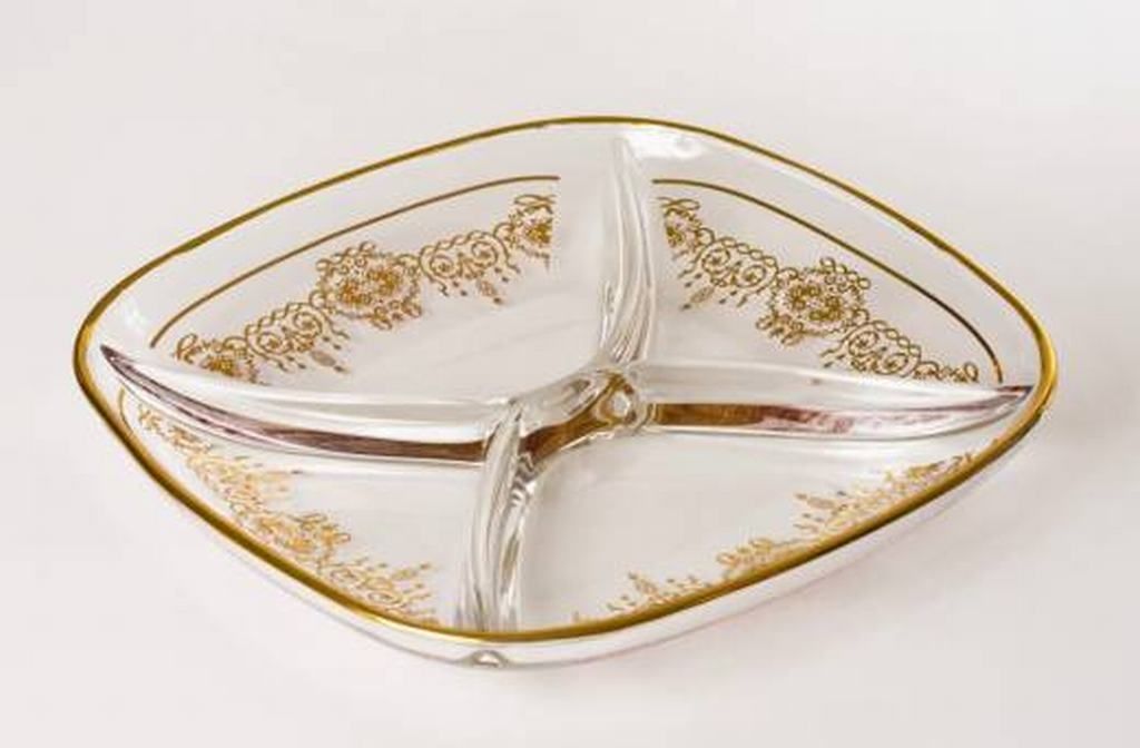 FINE ITALIAN CRYSTAL SECTIONAL SERVER - HAND PAINTED 14 KT GOLD DESIGN - DIVIDED IN 4 COMPARTMENTS - 10.5"x 10.5W"