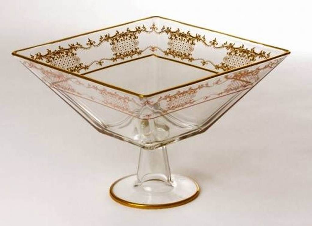 FINE ITALIAN CRYSTAL SQUARE BOWL - HAND PAINTED 24 KT GOLD DESIGN - 9.5L"x 9.5W"x 8H"