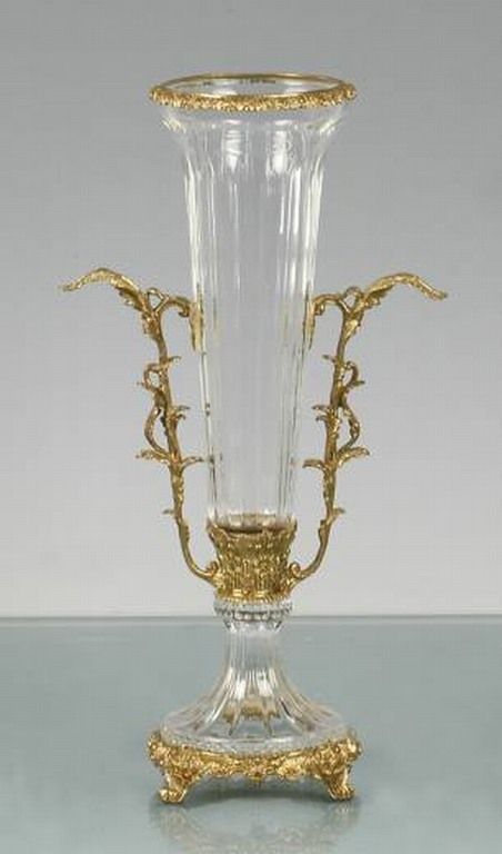 FINE ITALIAN LEAD CRYSTAL VASE - BRASS HANDLES AND TRIM - 9.8L" x 5.3W" x 16.9H"