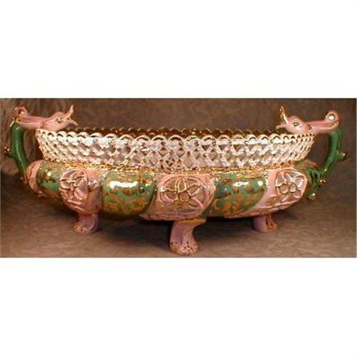 high-sided plateau style bowl has dophin handles, open or