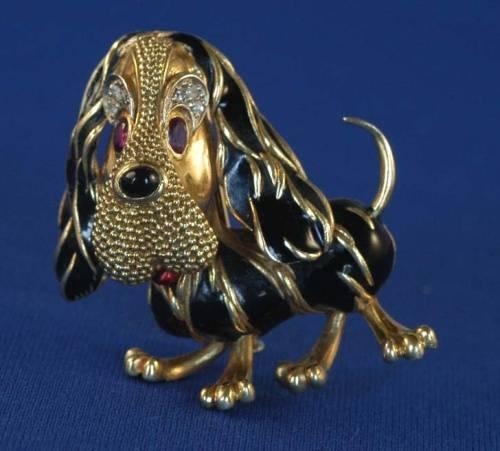 ITALIAN ENAMELED 18K GOLD DOG PIN with diamonds and rubies 37mm high, 26 grams tw<BR><BR><BR>Packing and Shipping: $10