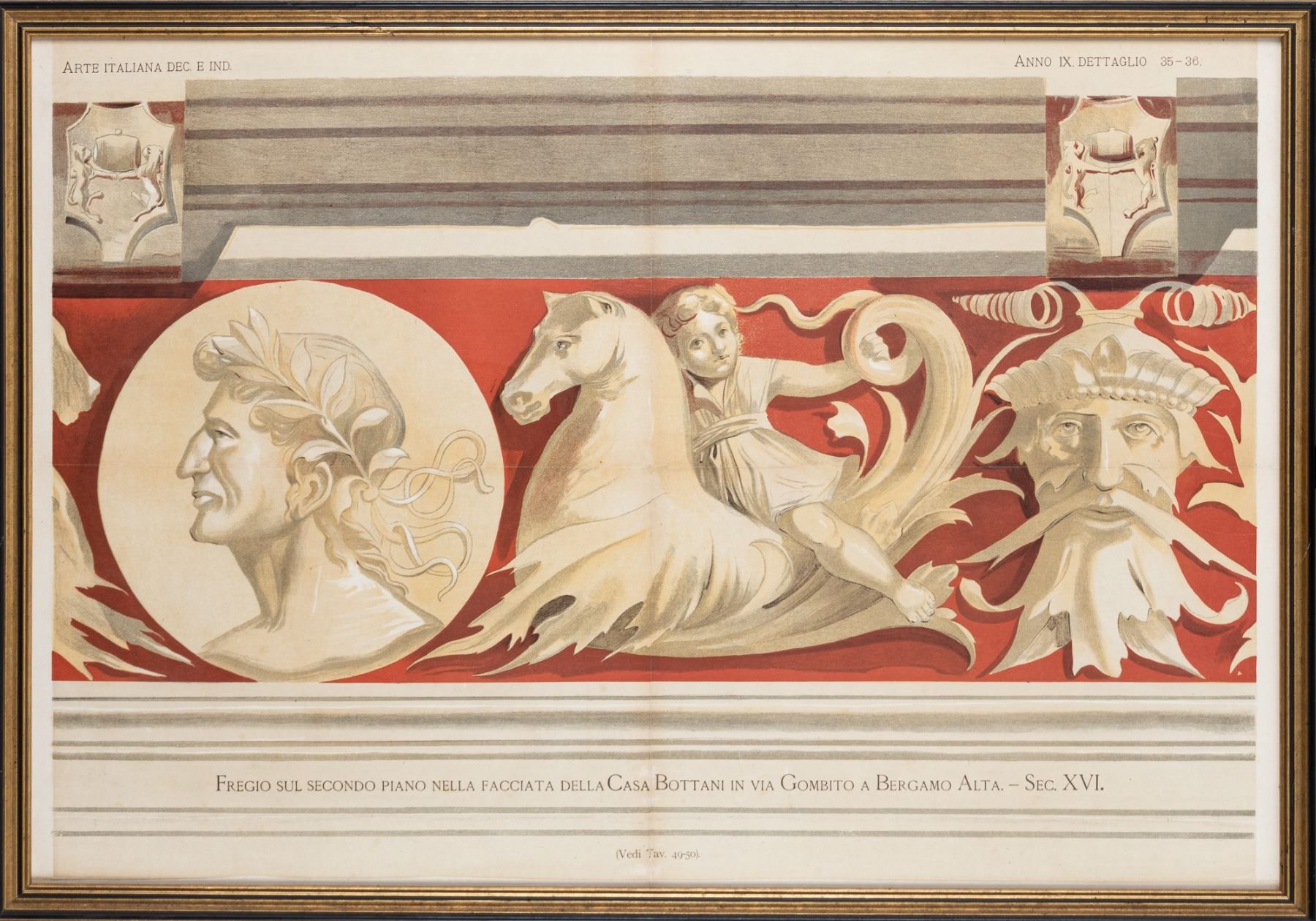 Framed print of an Italian fresco at the Bottani House. Visible area 34 x 23.25 inches. Overall area 36.25 x 25 inches. The fresco shows a young child riding a hippocampus, a mythological half-horse half-sea creature, between the heads one of mythological and crowned characters. The Bottani House is one of the last remaining houses in Bergamo, Italy which has frescoes from the sixteenth century. Visible area 34 x 23.25 inches. Overall frame size 36.25 x 25 inches. Made up of four pieces mounted together with some repairs at center line. Not examined outside of frame. Ready for display.