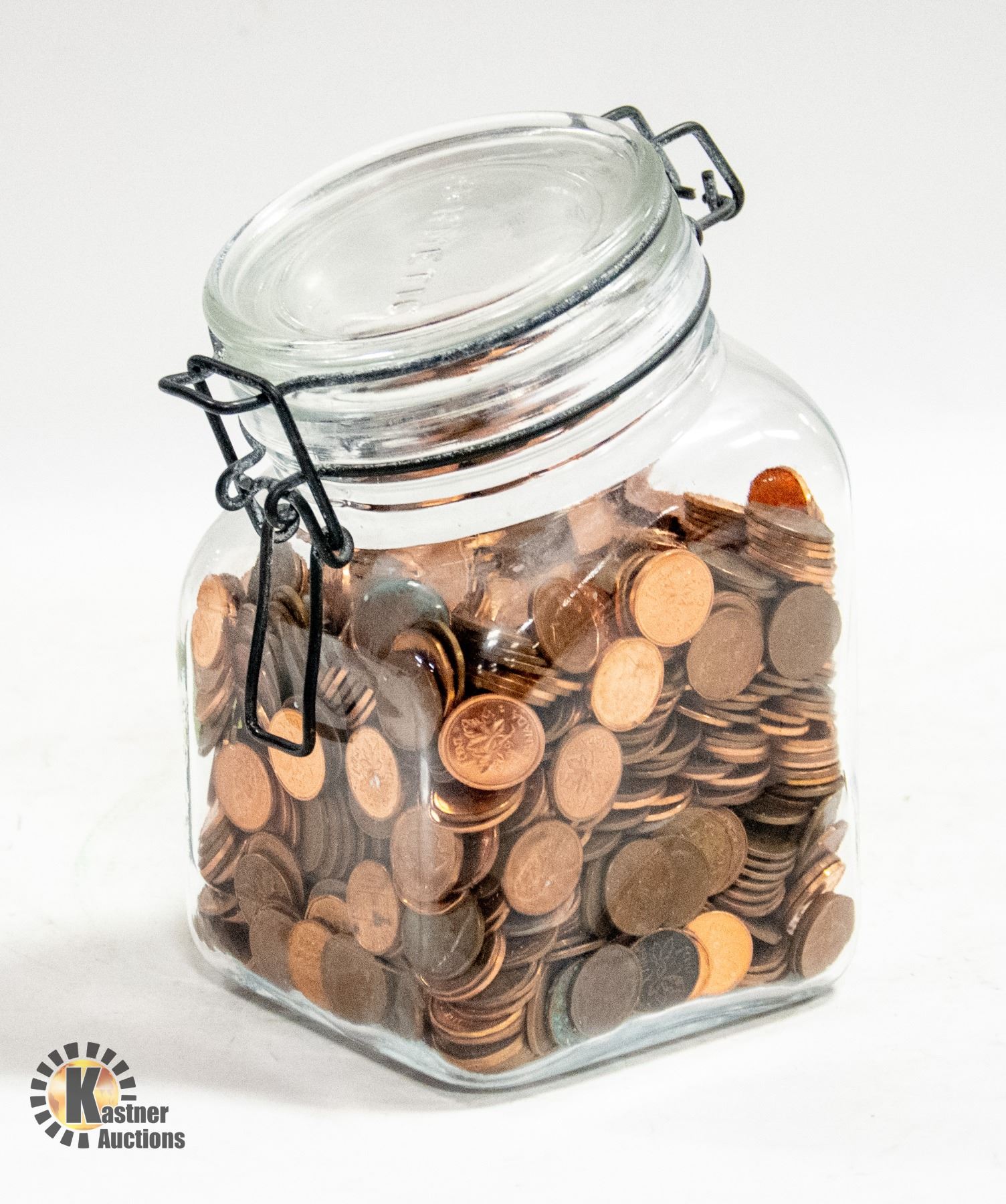 ITALIAN GLASS JAR FULL OF CANADIAN PENNIES