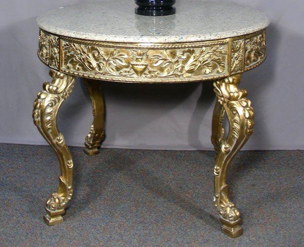 A round table with ornate carving on curved legs and edge. Completed with a beige and brown polished marble top. Very good condition. 33" high, 45" dia.