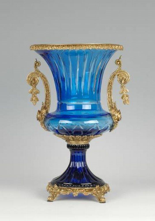 ITALIAN HAND CUT BLUE CRYSTAL VASE WITH BRASS HANDLES, BASE, RIM AND ACCENTS - 9.5WX9.5DX14H