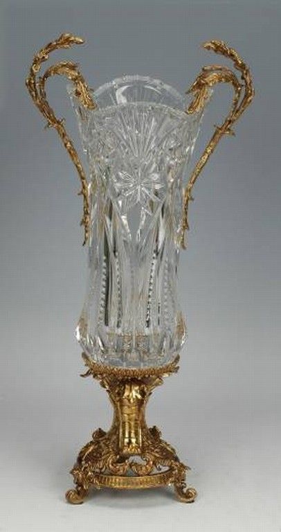 ITALIAN HAND CUT CRYSTAL VASE WITH BRASS HANDLES AND BASE - 17.3L" x 12.6W" x 22.8H"