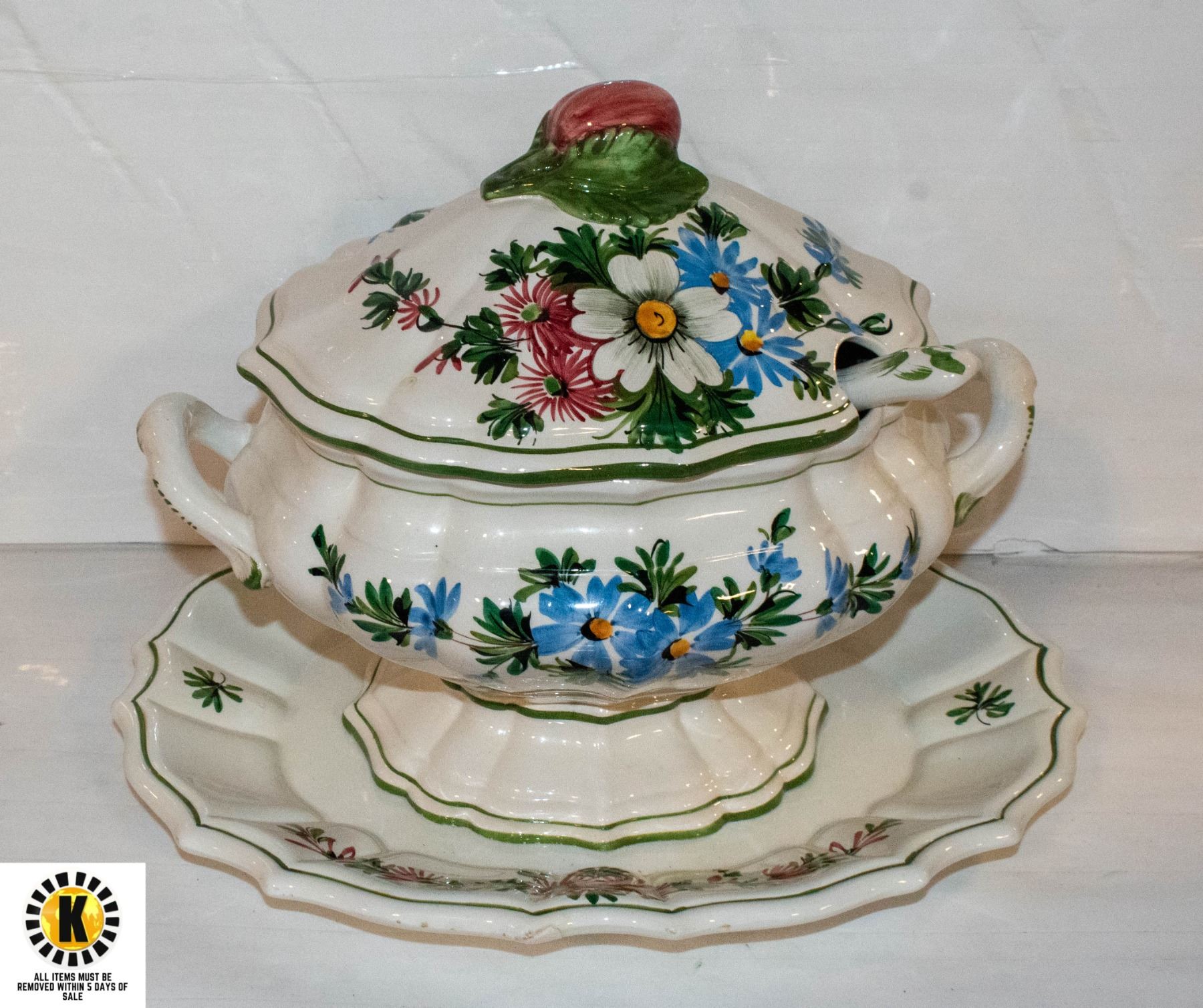 ITALIAN HANDPAINTED LIDDED TUREEN, PLATTER
